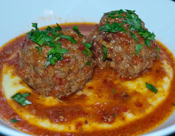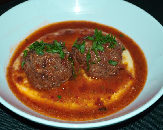 To accompany the meatballs, I envisioned serving them atop a warm deliciously creamy polenta. In my family, polenta was often served with meats and gravies, so this was a perfect fit for my dish. For this polenta I decided to use goat cheese for the mantecatura instead of Parmigiano. I love goat cheese and I think it add a certain je ne sais quoi to what was often considered a peasants food.