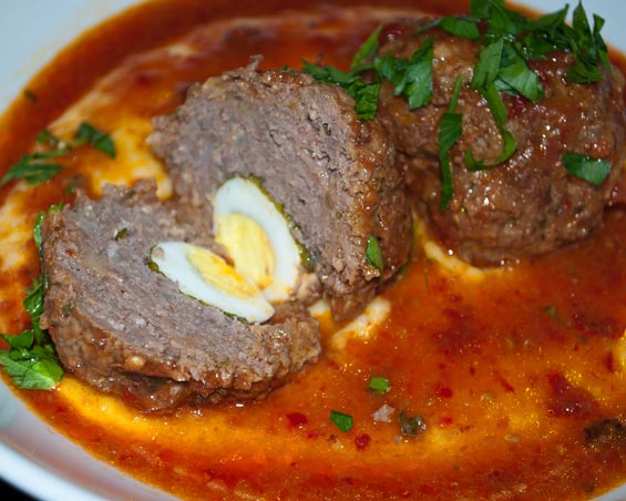 17. Take a handful of meat, a little smaller than a major league baseball, and flatten in your hands to form a relatively thin patty. Take one quail egg and one leaf of mint and place in the center of the patty. Close up all sides of the patty and form your meatball. It is VERY important to ensure that there are no seams in the meatball or the meatball will break open when cooking!