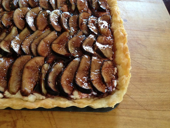 Smooth onto tart, arrange figs on top and brush some of the reduced mosto cotto syrup over the fruit. Serve as is or it’s delicious to lay a slice of prosciutto di parma on top.